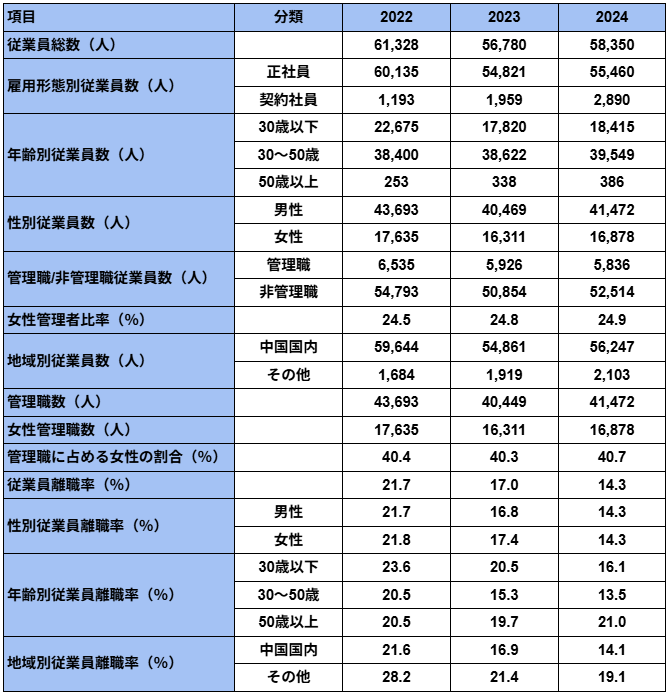 注目すべきは、従業員の離職率が大幅に改善している点だ。2022年には 21.7% だったが、2023年に 17.2%、そして2024年には 14.3% まで低下している。