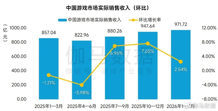 2026年1〜3月の中国ゲーム市場の実売収益は約2兆1378億円(971.72億元)。前四半期比2.54%増、前年同期比13.38%増となった。春節期間中のユーザー活動量・課金意欲の向上と、節日テーマのバージョン更新が収益を押し上げた。長期運営タイトルと新作のどちらも市場規模の拡大に寄与した。
