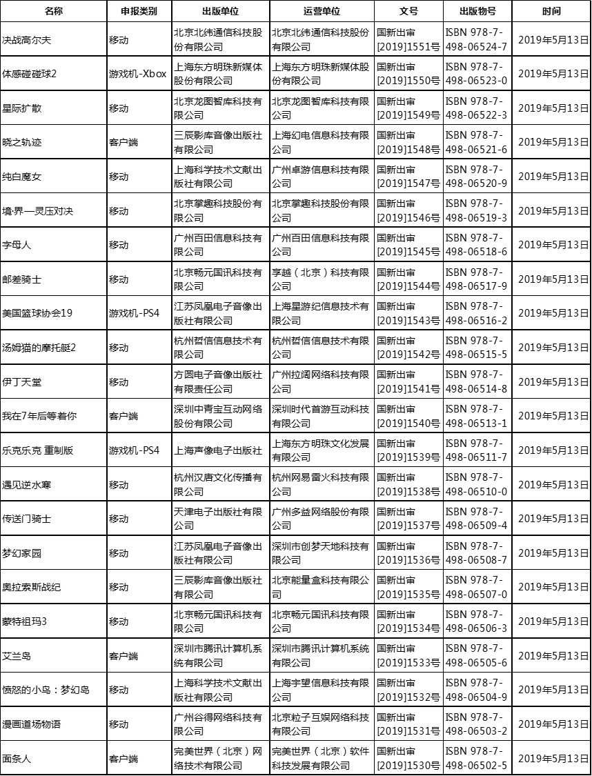 出所:中国国家新聞出版広電総局 2019年进口网络游戏审批信息(2019.5.13)
