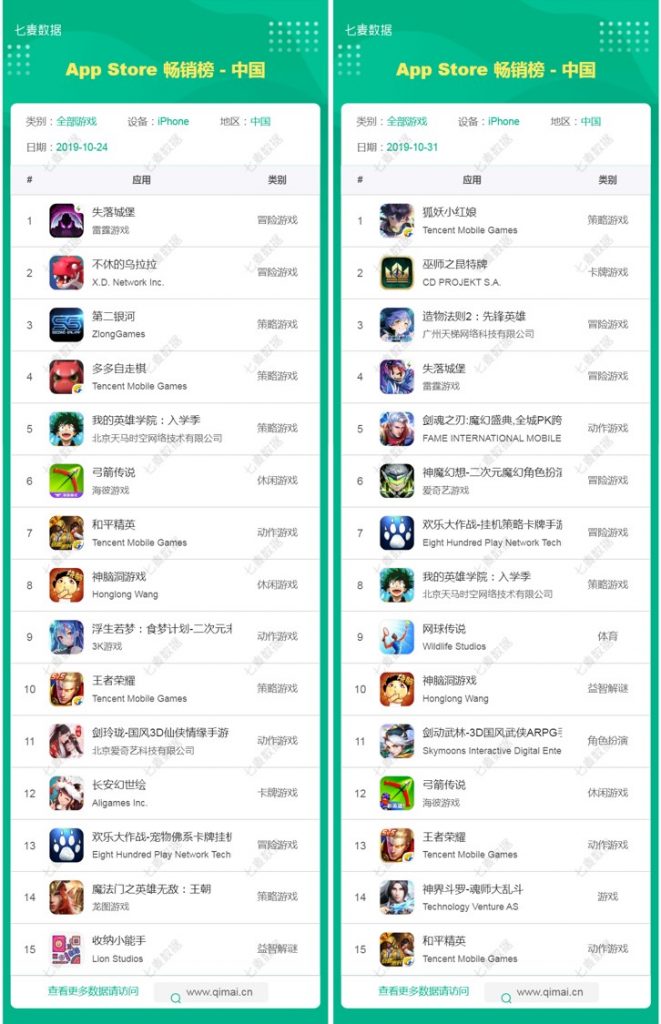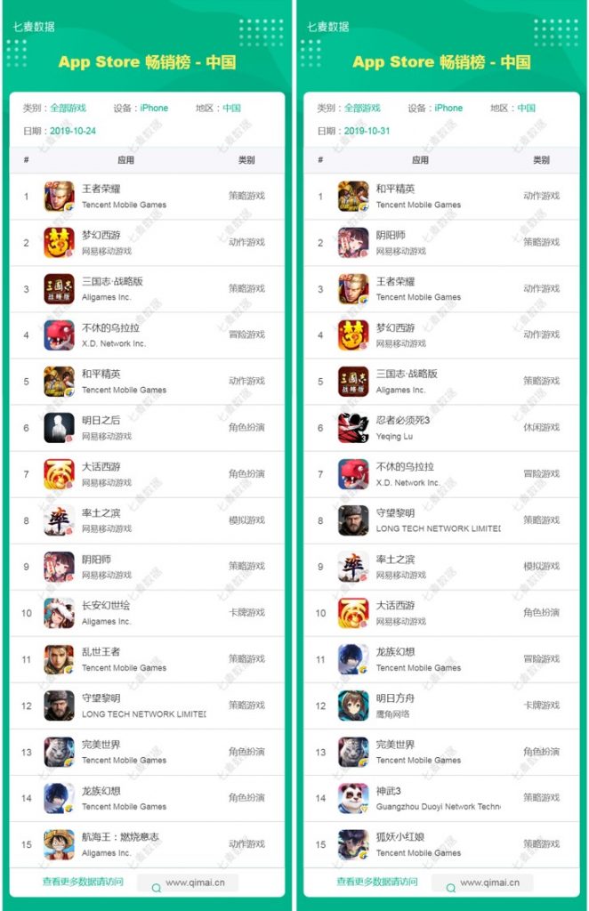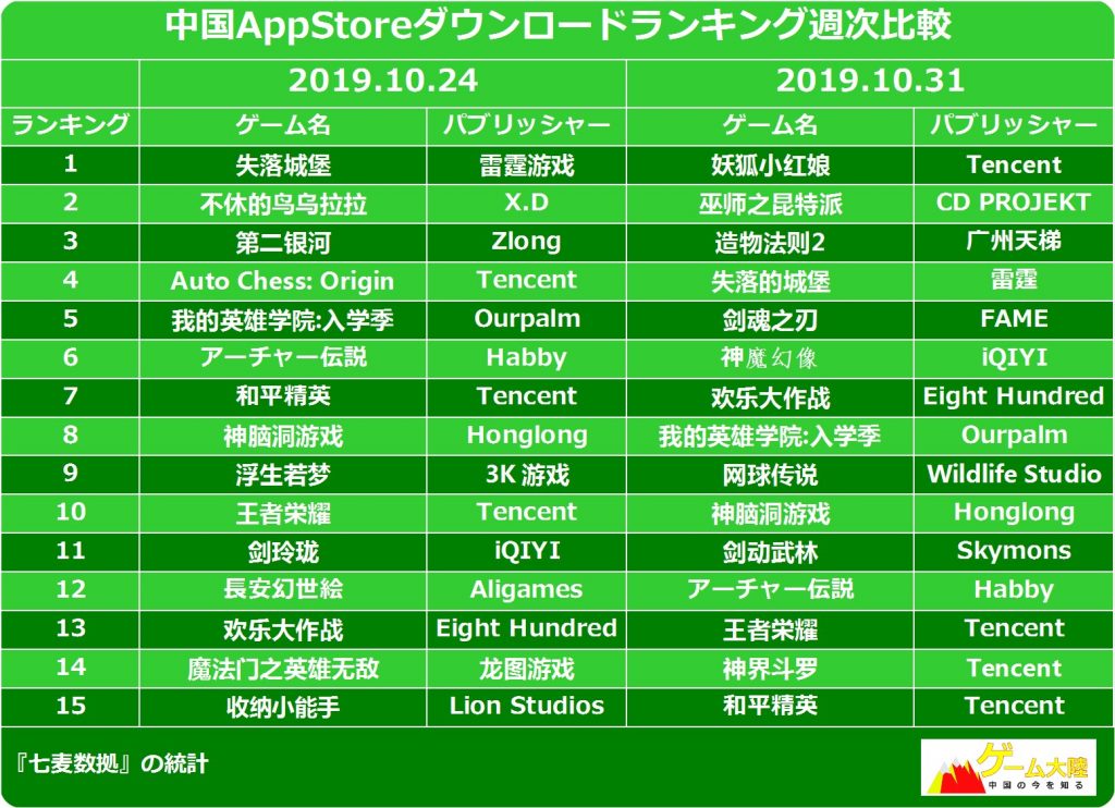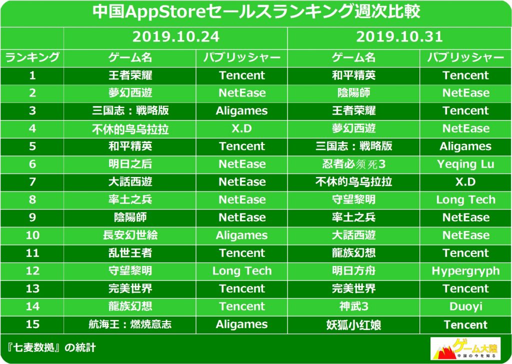 10月24日(木)と10月31日(木)の中国AppStoreセールスランキングTop15は以下の通りだ。