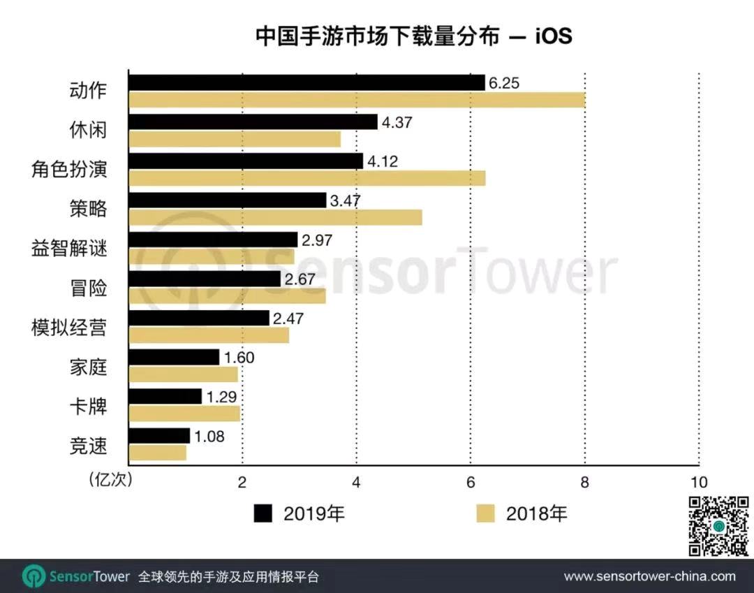 また、2019年中国スマホゲームのApp Storeのジャンル別ダウンロード数を見てみると、カジュアルゲーム以外は全て前年比減少となっている。