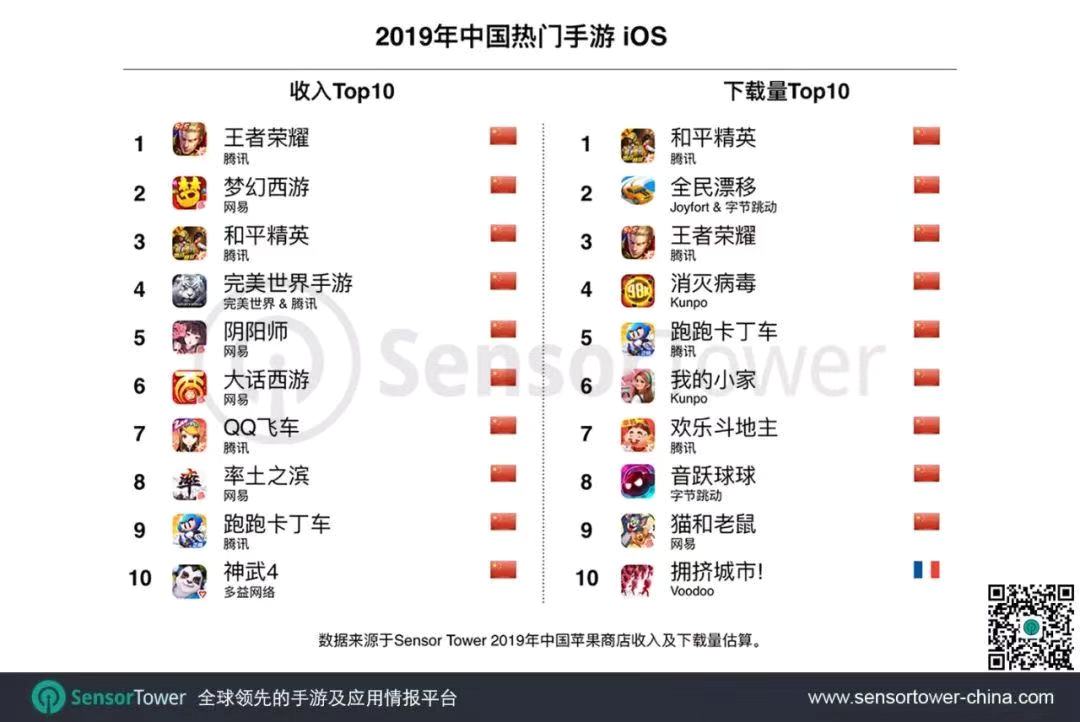 『Sensor Tower』が発表した2019年中国スマホゲームのApp Storeの売上、ダウンロードのTop10は以下の通り。