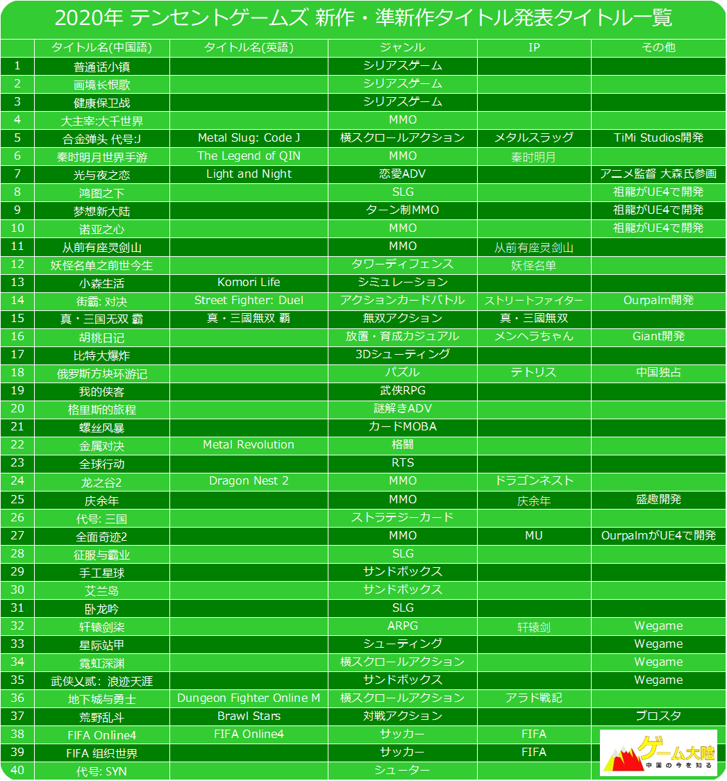 先ずは今回テンセントが発表した、新作、準新作にあたる40作を以下にリストアップしたので、これに目を通した上で、下に続くタイトル概要をチェックして欲しい。