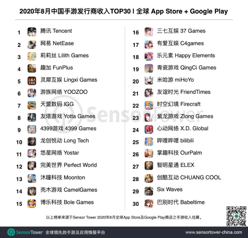 Sensor Towerが発表した2020年8月の中国スマホゲームパブリッシャー全世界売上Top30は以下の通り。(注:中国Androidストア売上は含まない。)