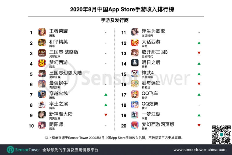 また、同時に発表された2020年8月の中国App StoreセールスランキングTop20によると、ランキング上位に大きな変化は見られず、Aligameの『三国志幻想大陸』、Leitingの『最強蝸牛』、Perfect Worldの『新神魔大陸』がTop10に定着している。