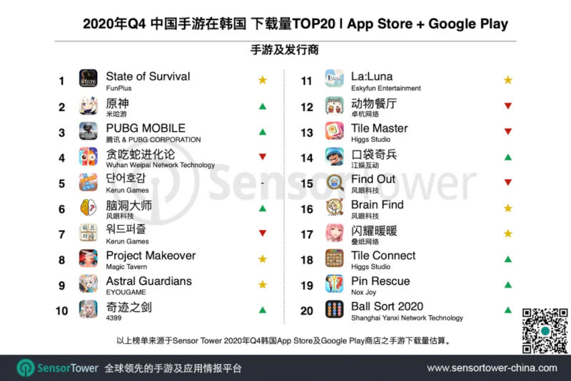韓国市場は多くの中国企業が繁体字圏に続き最初の展開国として選ぶことが多く、Q4もQ3に続き『State of Survival』『Project Makeover』など6タイトルが新たにランクインしている。