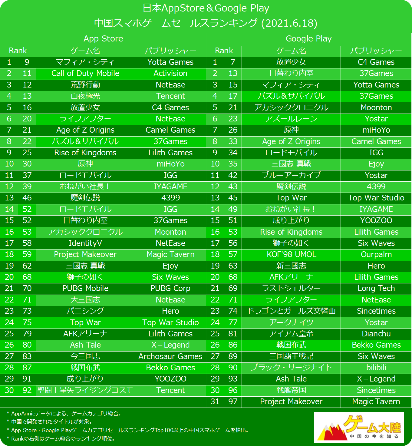 日本市場の中国ゲーム売上ランキング(2021.6.18)