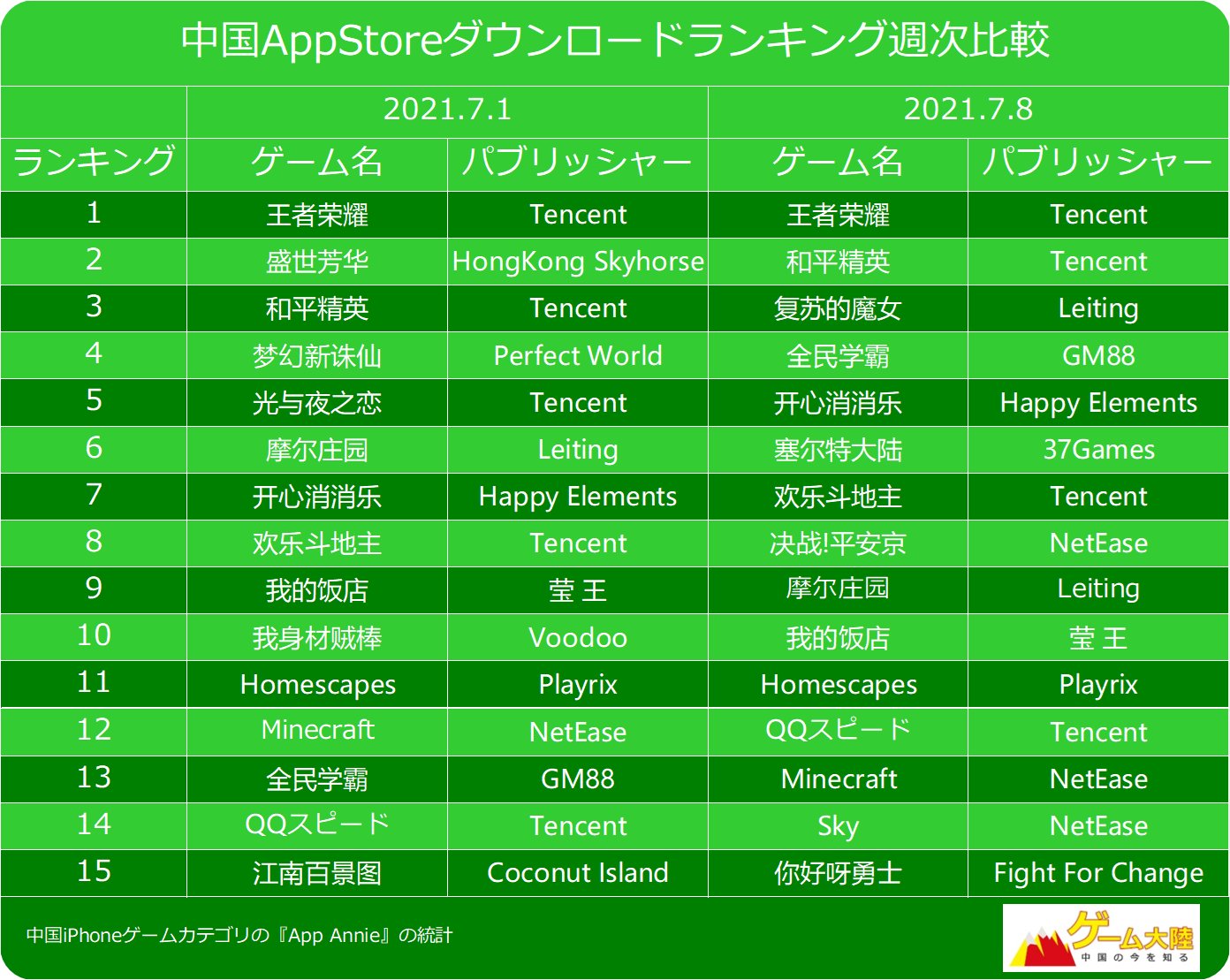 他にもPerfect Worldの『梦幻新诛仙』、37Gamesの『塞尔特大陆』などの新作もランクインしているが、NetEaseの『決戦!平安京』や『マインクラフト』、テンセントの『QQスピード』、Playrixの『Homescape』など長期運営タイトルがTop15に再浮上している。