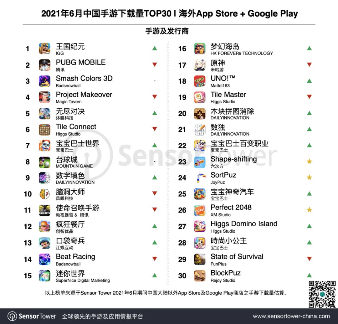 2021年6月の中国産スマホゲームの海外市場ダウンロードランキングTop30は以下の通り。