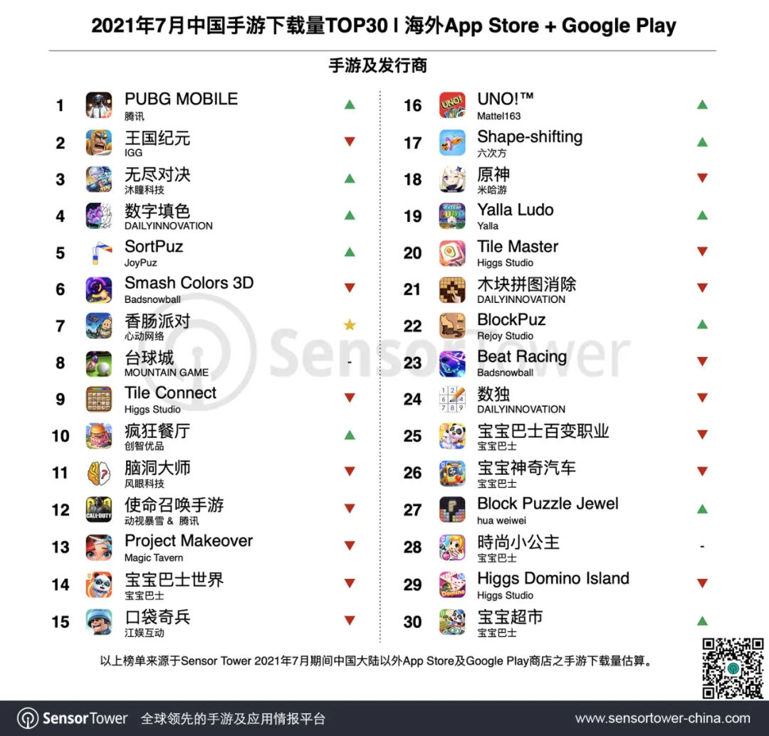 2021年7月の中国産スマホゲームの海外市場ダウンロードランキングTop30は以下の通り。
