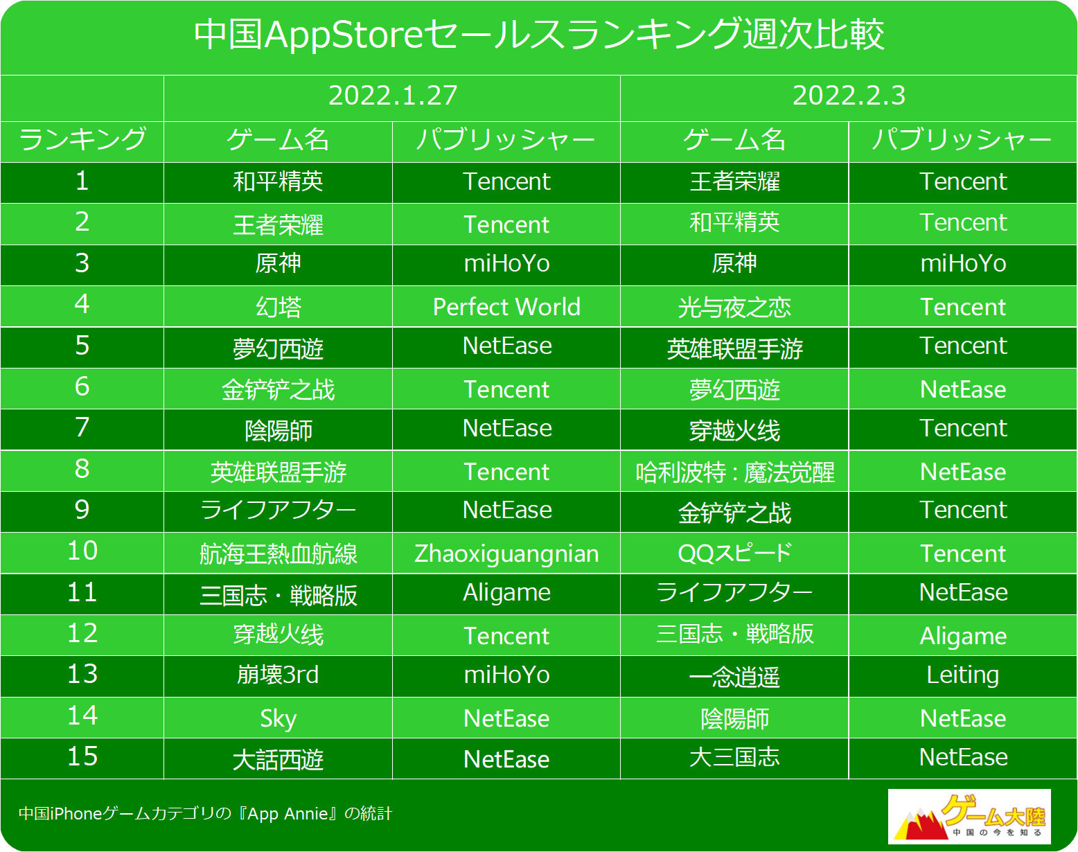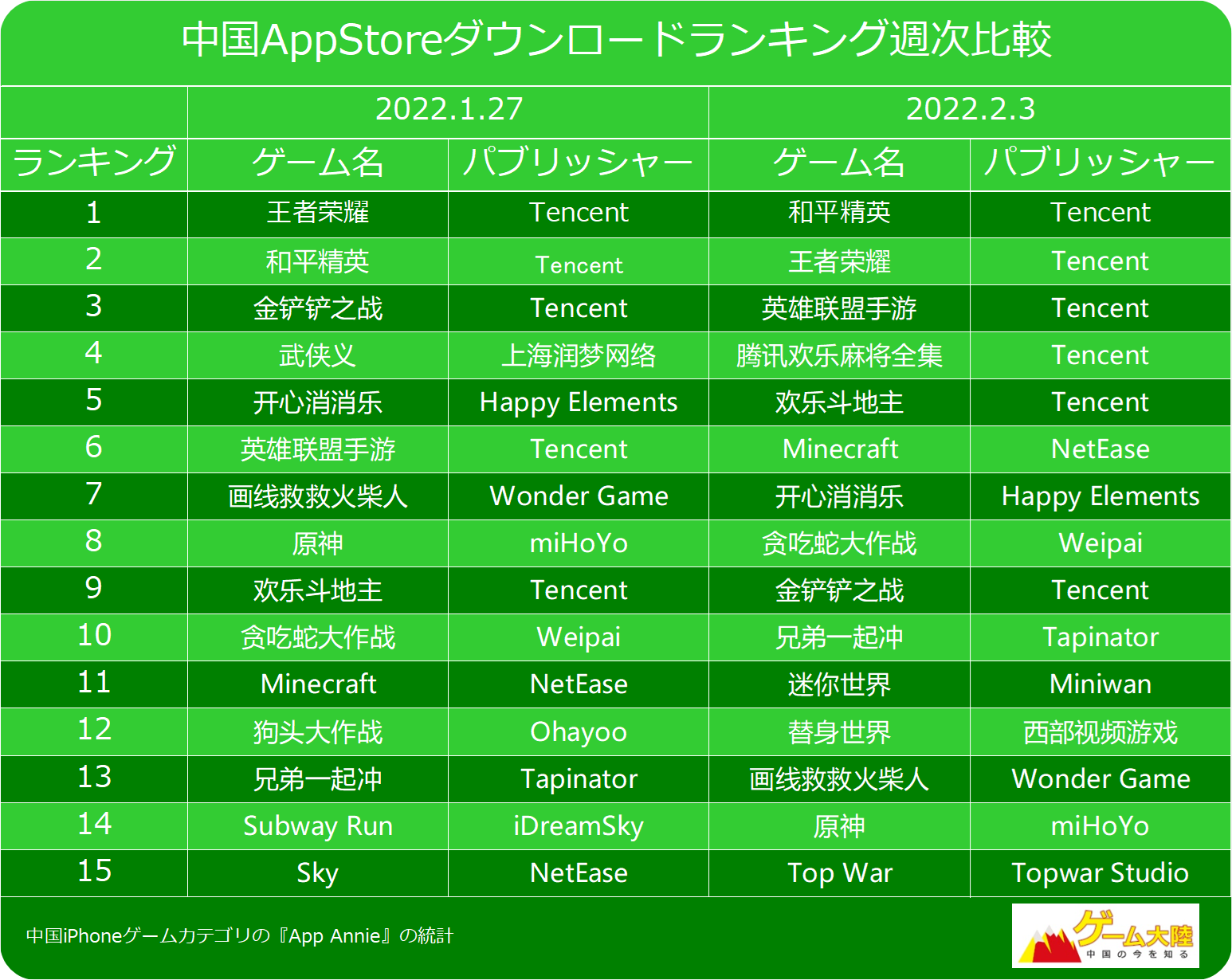 Top1は『和平精英』、Top2は『王者栄耀』と常時と変わらないが、Top4に『腾讯欢乐麻将全集』、Top5に『欢乐斗地主』といった麻雀・ポーカー系のゲームが上位にくるなど季節要因も影響している。
